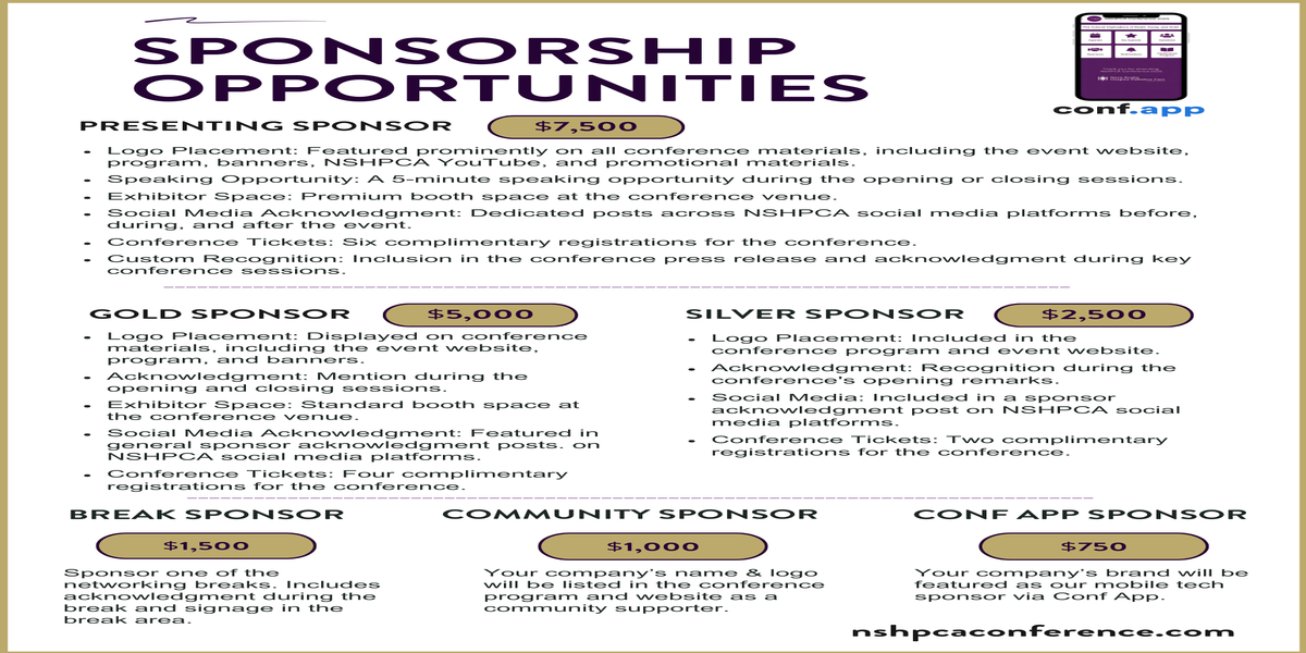 To inquire about sponsorship opportunities for NSHPCA Conference 2026, please click on the proposal provided to your left.